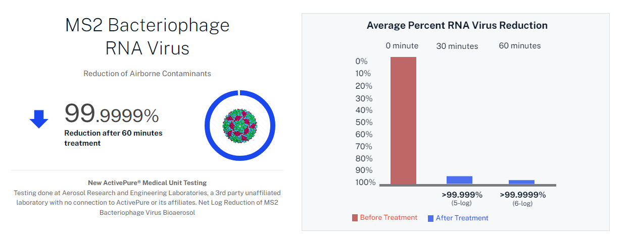 Units with ActivePure® Technology pull free oxygen and water molecules in the air through ActivePure® Technology's patented honeycomb matrix. The technology creates powerful oxidizers, known as ActivePure® Technology Molecules, that are then released back into the room, where they seek and reduce DNA and RNA viruses including SARS-CoV-2 (novel coronavirus), Swine Flu (H1N1), Avian Bird Flu (H5N8), Hepatitis A (HAV) and MS2 bacteriophage, regardless of their size, on surfaces and in the air.